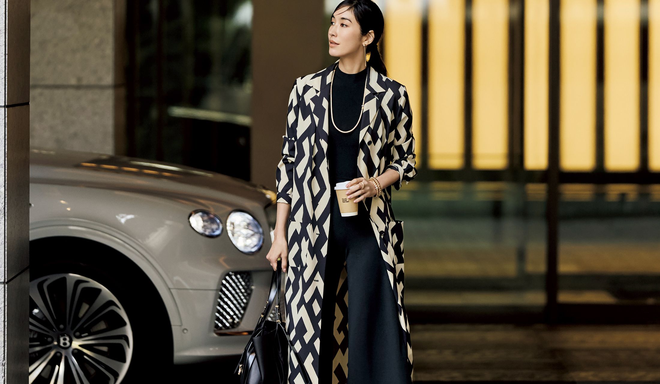モダンな柄がダイナミックに広がるロング丈のシャツコートに、ニットのクロップドトップス&フレアパンツを合わせて、颯爽と搭乗。イタリアの老舗織物メーカーでプリントされたコートは、なめらかなウールの一枚仕立て。ロングフライトも快適に過ごせる。