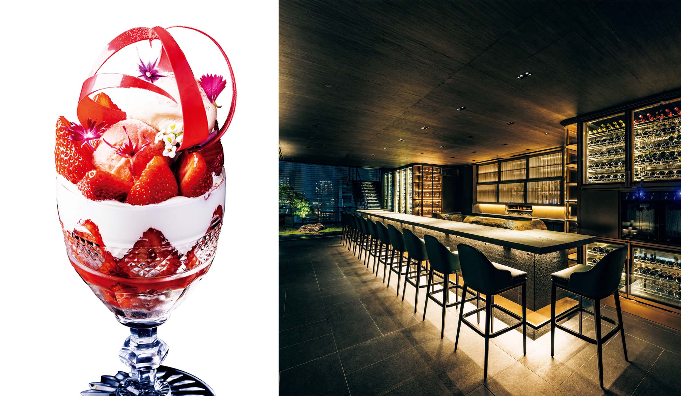 1586年創業のフランスのクリスタルメゾン「サンルイ」と、パリ1区に「Restaurant KEI」を構えるシェフ・小林 圭氏。二者がタッグを組むバーでは、贅を尽くした『季節のパフェ』(¥3,200)がクリスタルグラスで提供される。