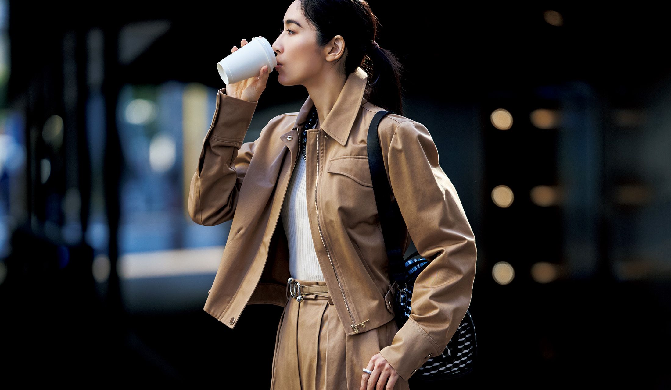 軽やかな腰丈ブルゾンに、タック入りのワイドパンツを合わせ、メリハリの効いた着こなしに。ナチュラルなサンドベージュの一枚は、ブルゾン本来の機能的な意匠を残しながら、スマートな表情が魅力。