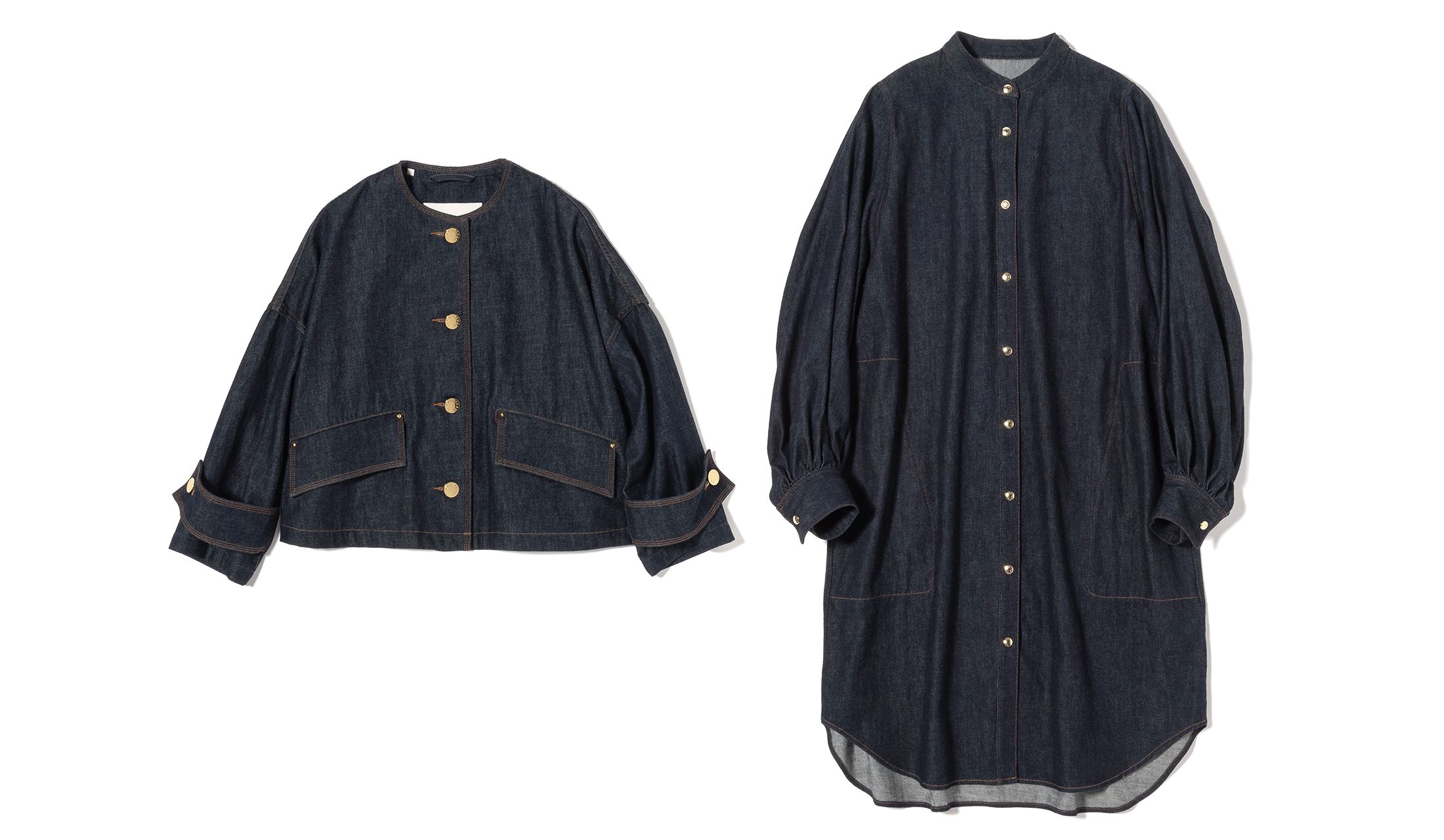 1よりもさらに柔らかい8オンスのデニム素材で仕立てられたワンピースは、スタンドカラーのデザインがクラシカルなムード。ドラマティックなボリューム感のあるパフスリーブが、ほのかな甘さをトッピングしています。手持ちのベルトでしっかりウエストマークして印象を変えたり、パンツと合わせてチュニック風に着こなしたり、前を開けて羽織るなどアレンジを楽しめるアイテムです。