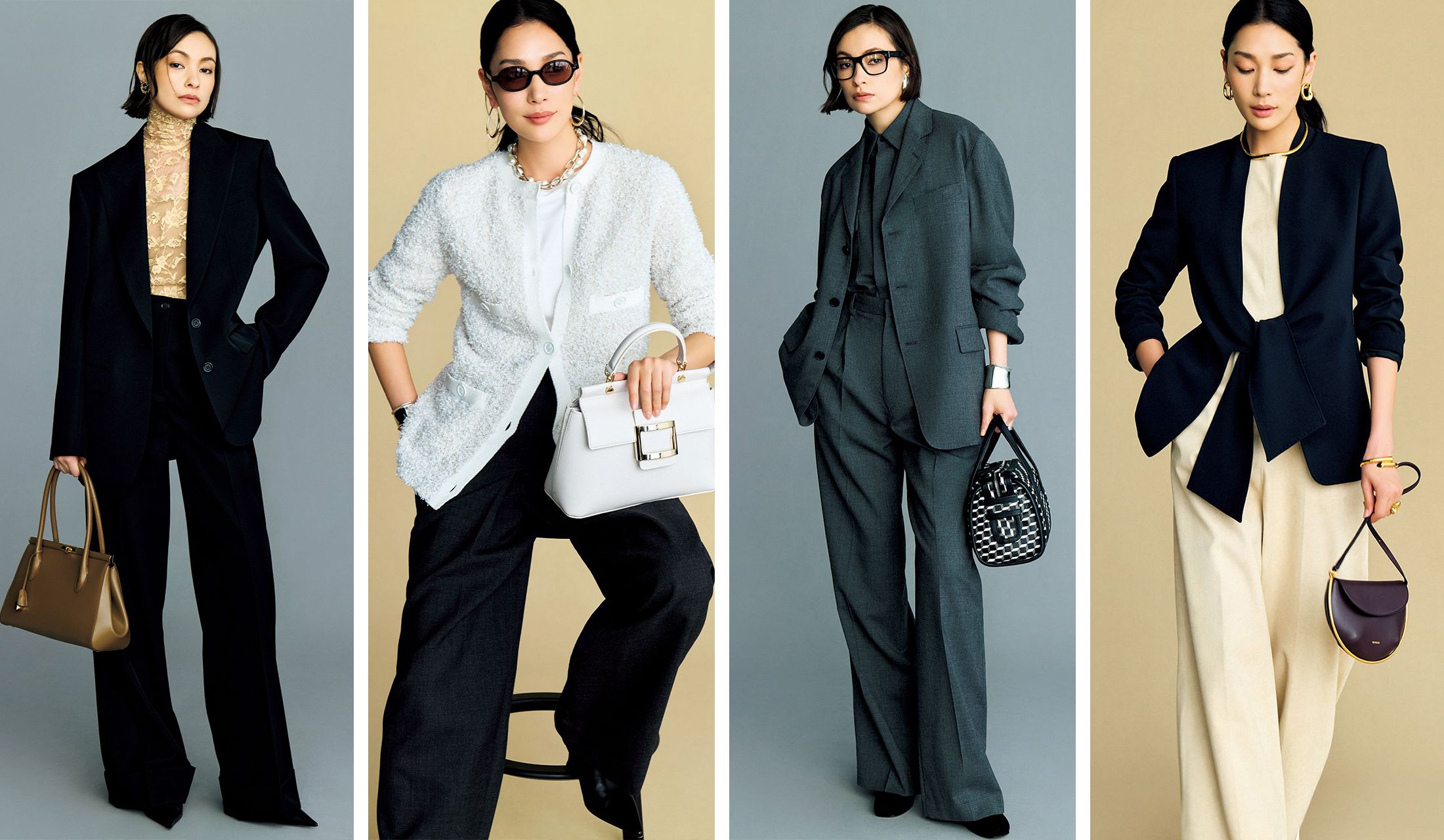 仕事スタイルの定番としてだけでなく、トレンドアイテムとしても注目のジャケット。代表的なデザイン「端正テーラード」と「華やぎノーカラー」を今の視点で選ぶなら?