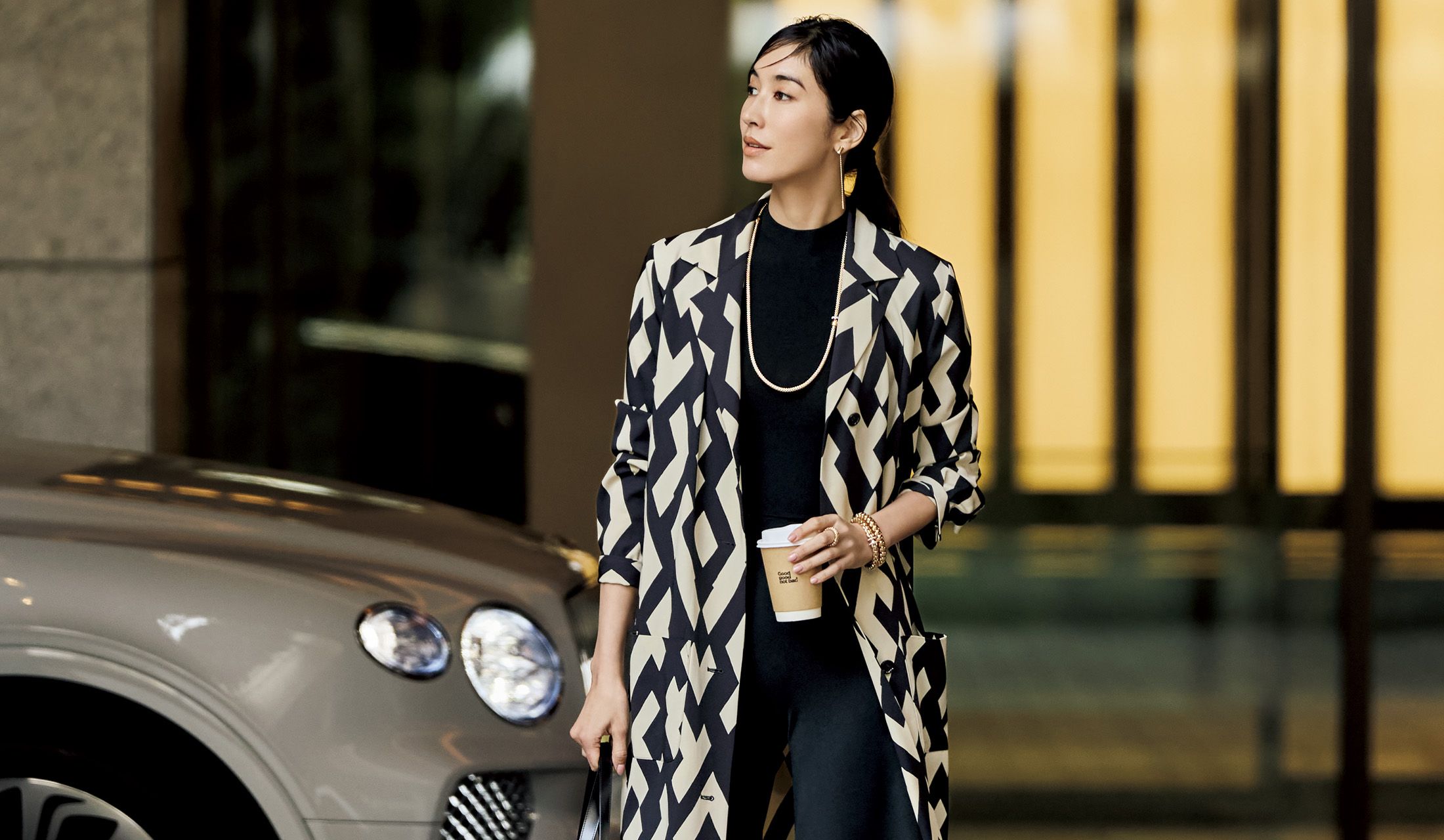 モダンな柄がダイナミックに広がるロング丈のシャツコートに、ニットのクロップドトップス&フレアパンツを合わせて、颯爽と搭乗。イタリアの老舗織物メーカーでプリントされたコートは、なめらかなウールの一枚仕立て。ロングフライトも快適に過ごせる。