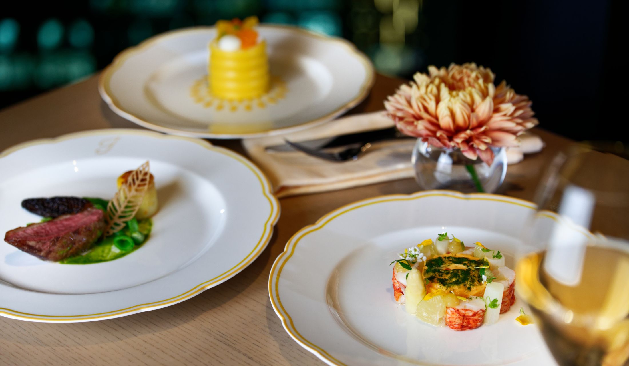 眼下に広がる、瑞々しい緑の情景を表したのが「オマール海老のポシェ」。ディナーのシグネチャーとして愛されたオマール海老が鮮やかに再構築された、1周年の節目を祝う一皿です。