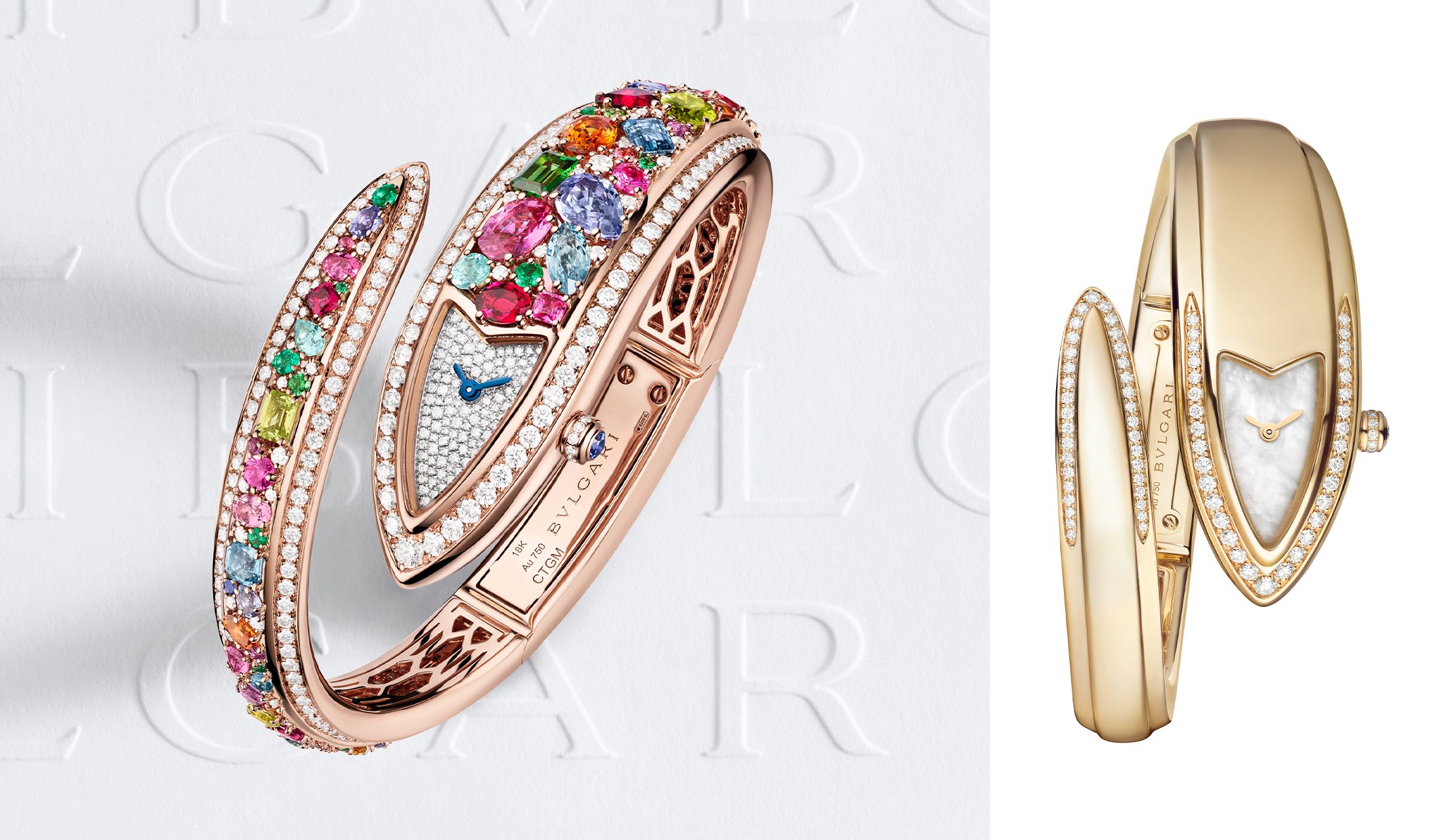 これまでも「ブルガリ」のウォッチメイキングのテーマとしてクリエイションの核であり続けてきた「ゴールド」。このモデルでは、バングルブレスレットの両端 ── 蛇のグラフィカルな頭部から尾までのラインに沿って配されたダイヤモンドのラインが、イエローゴールドの色彩と輝きを際立たせ、文字盤のマザー・オブ・パールとノーブルなコントラストを描きます。