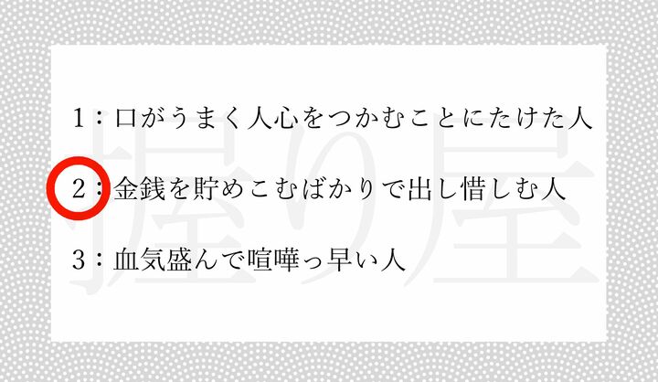 正解は… 2:金銭を貯めこむばかりで出し惜しむ人 です。