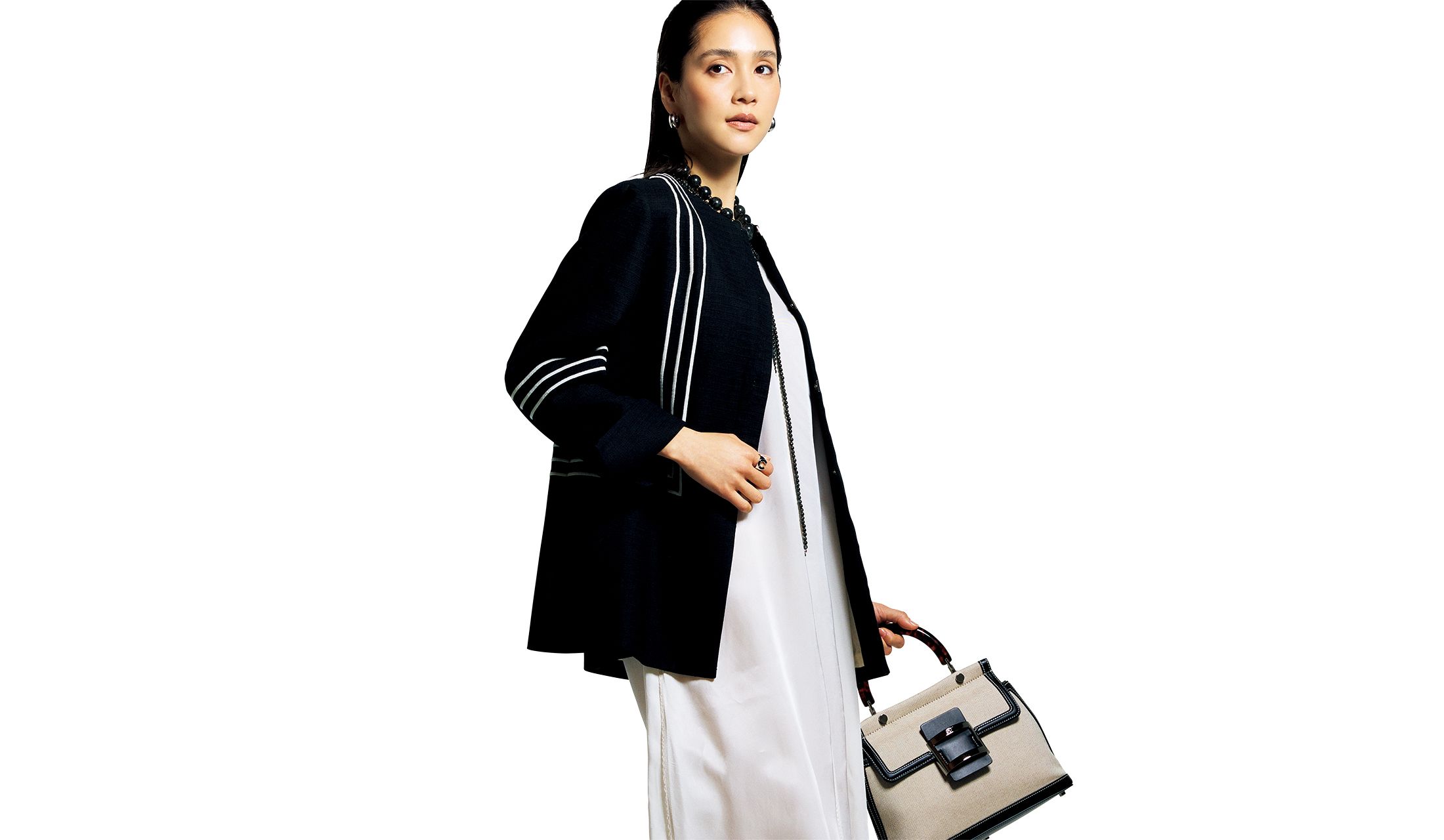 ライン入りジャケットで、モノトーンをレトロモダンに更新