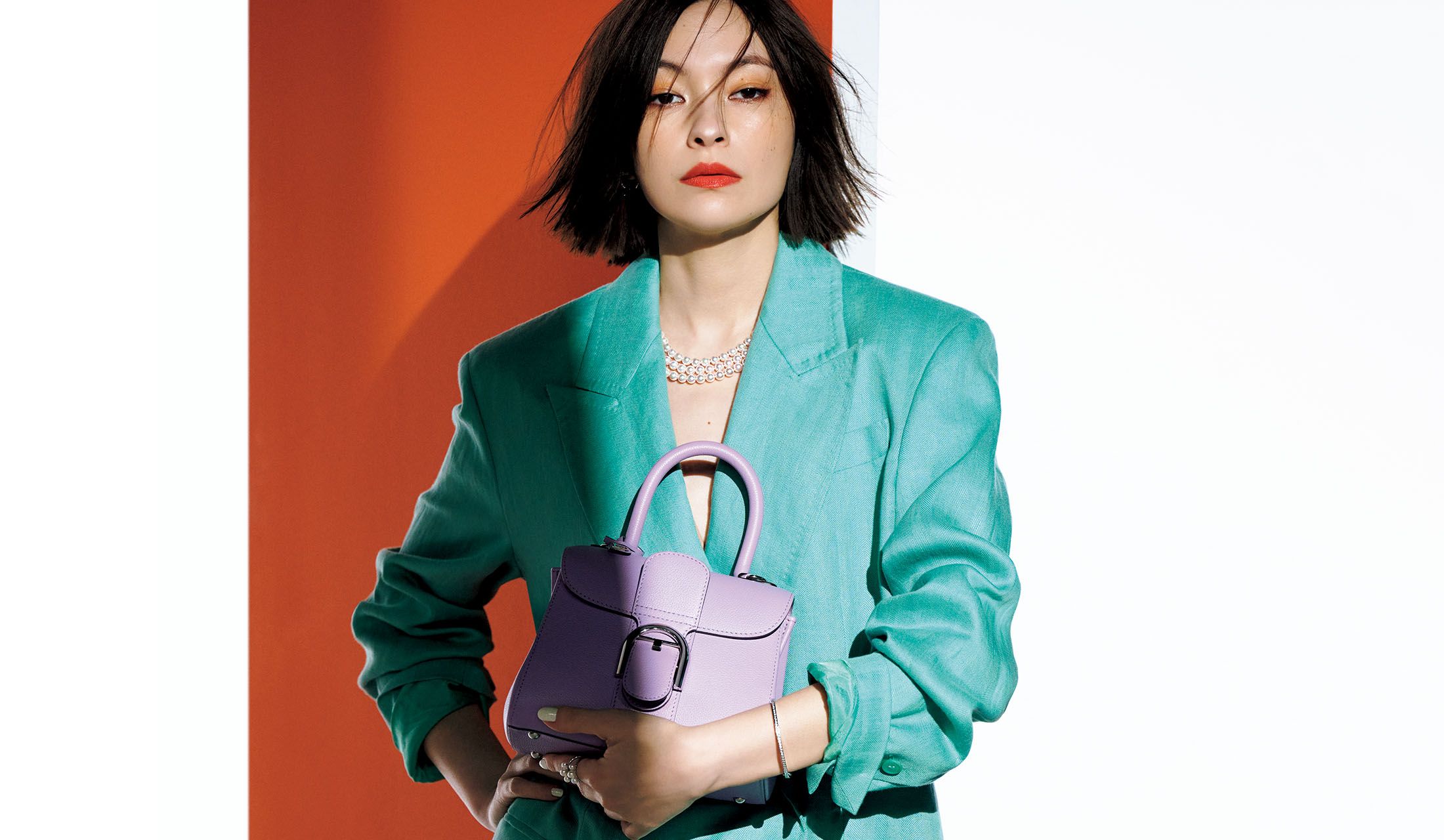 “水”という名を冠した淡いパステル調のブルーグリーンのスーツがワントーンで爽やかなインパクトを与える着こなし。そこにラベンダーのようにほんのりとしたパープルのバッグを合わせて、清潔感溢れる大人のパステルを印象づけて。胸元にはパールの瑞々しい白で、クリアな光沢を添えたい。