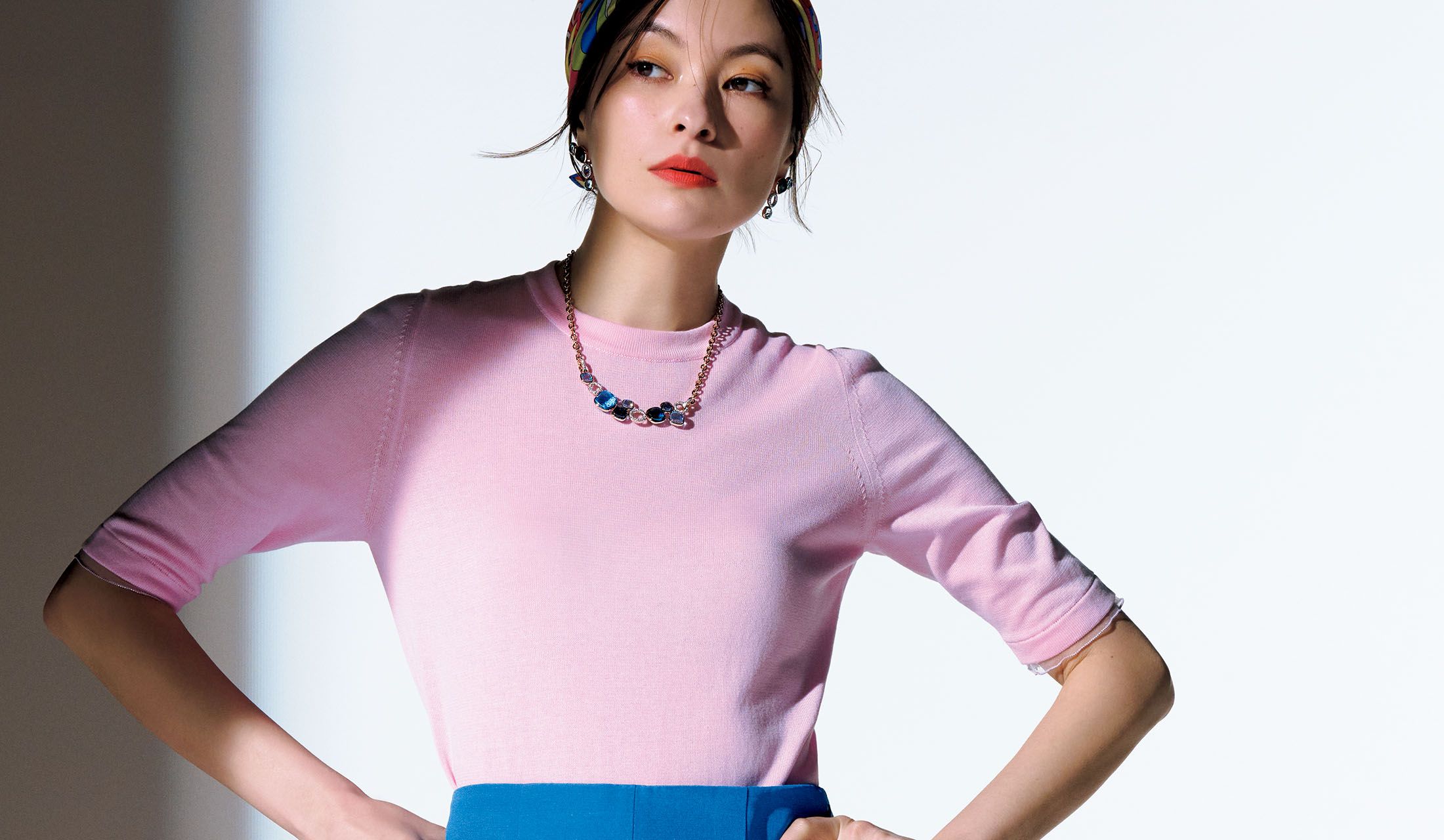 ピンクとブルーという色温度が対極にある配色が、洗練されたハッピー感を誘う。透明感のあるブルーの石を胸元にあしらい、さらにコントラストを強調。