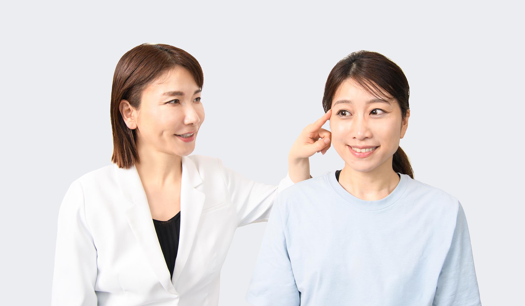 人差し指を目尻の外側の凹んだ部分に当てます。軽く押してみて硬くなってコリを感じる部分を探してみましょう。硬いのは歪みや筋肉の緊張のあらわれです。左右それぞれ確認し、硬さの違いも感じてみてください。