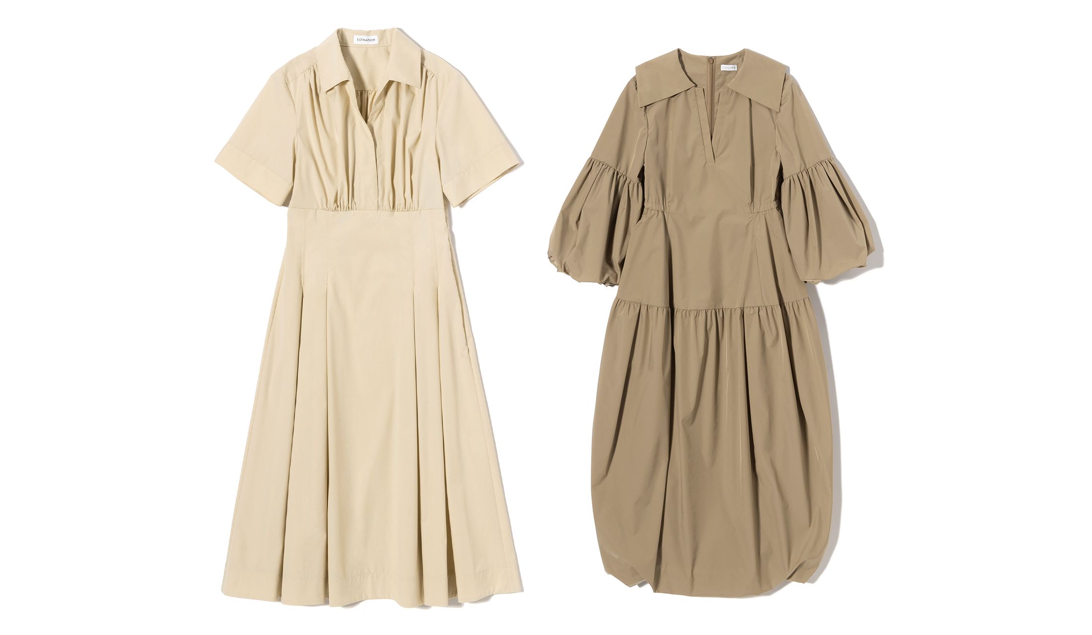 「エストネーション」が手掛けるオリジナルブランド「コラム」のワンピースは、バルーンシルエットのスカートや袖により、大胆なメリハリを効かせたデザイン。大きな襟を備えた深めのVネックが上品な抜け感を授けます。
