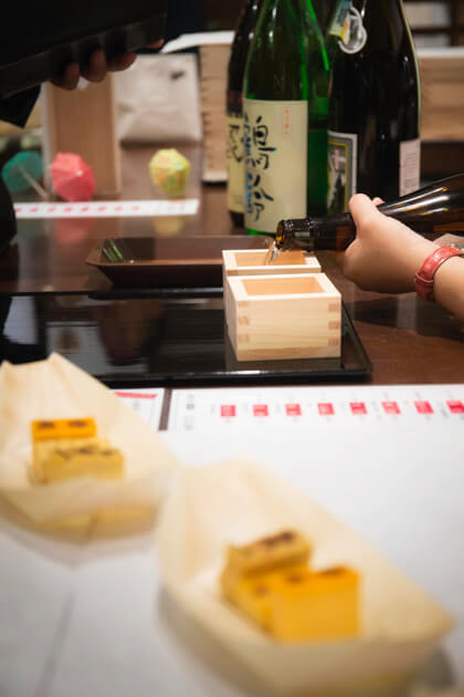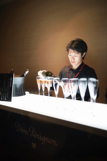 一幕と二幕の幕間には、新橋演舞場の特設のお茶席で、芸者衆がお抹茶を点ててくれるという、雰囲気たっぷりのサービスが。「東京𠮷兆」のおつまみとドン ペリニヨンのシャンパンも供され(※有料)、幕間の時間が一気に華やぎます。