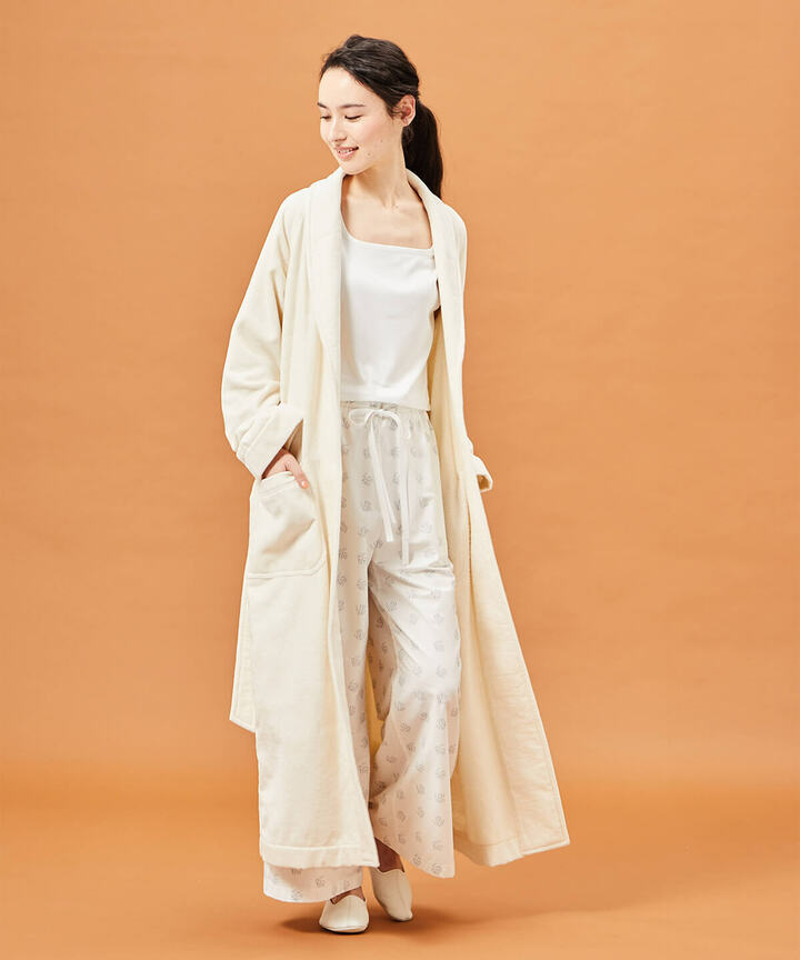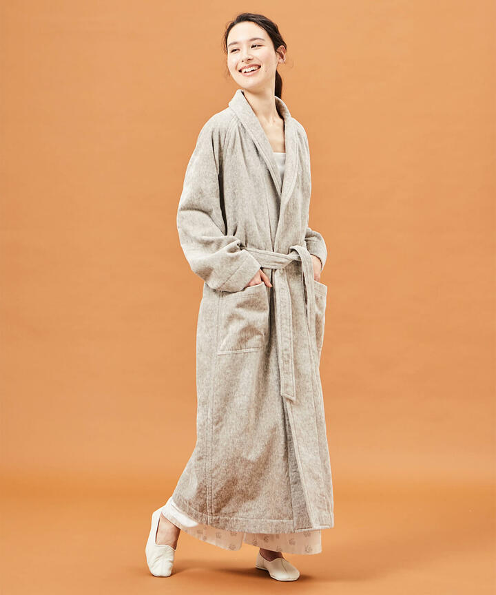 「ガウンシリーズも人気です。夏はお風呂上がりにバサッとバスローブとして、冬はパジャマの上にふわっと暖かガウンとしてお使いいただけます。コートに見間違うほどのシルエットであり、ワンマイルウエアとして、つまり自宅から1マイルほど、ちょっとそこまで出かけるときに着用するウエアとしても重宝するようです」(Foo Tokyo 担当者)