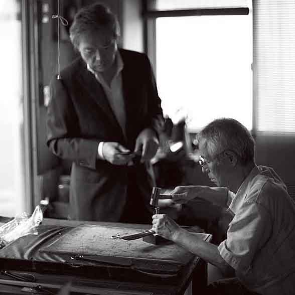 と、専務の大峽宏造さんが手にするのは、コードバンの靴べらである。その誕生の背景には、前述の落合氏との親交がある。同行した和食の店でのこと。きちんと靴紐を解いた靴に、靴べらを使って、足をすっと滑らせて履く落合氏の所作を見た。その悠々とした姿が、大峽さんに、この靴べらをつくらせた。