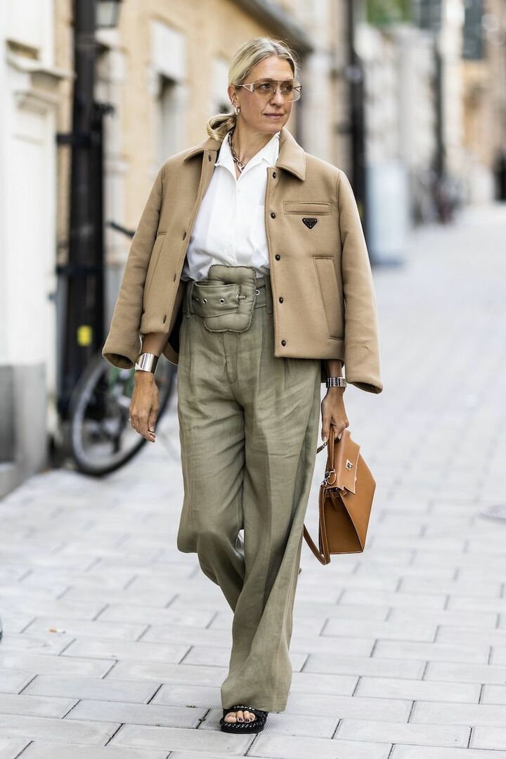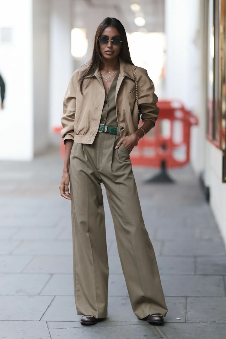 ジャンプスーツのように着こなせるカーキのシャツとワイドパンツのセットアップ。ハイウエストパンツをこっくりと深みのあるグリーンベルトでマークしながら、ベージュのブルゾンで視線を上に誘導すると腰高になりスタイルアップ効果大。ベージュとカーキが共鳴し、大人のサファリルックが完成。