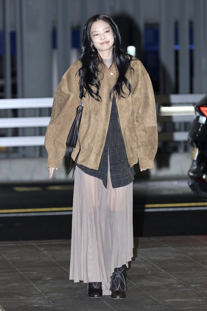 ビッグシルエット、スエード素材という重厚感のあるベージュブルゾンを着用していた「BLACKPINK」のジェニー。グレージュのシアーワンピースで軽重を表現し、メリハリをオン。あいだに挟んだメンズライクなチェックシャツが90sなグランジミックスを彷彿とさせます。