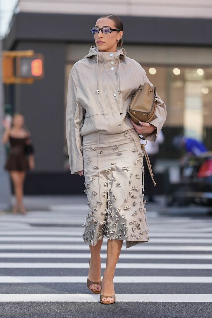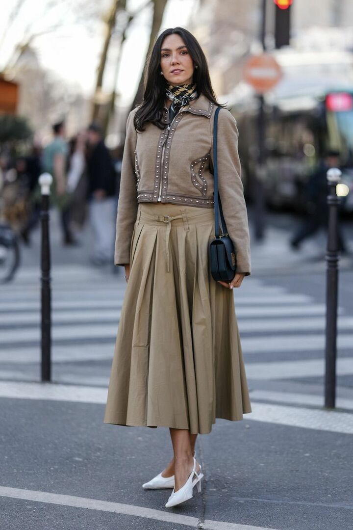 立体的な装飾が施されたベージュのマーメイドスカートは、ブルゾンとともにシャカシャカとした素材なら適度な抜けが生まれ、気張って見えずにあか抜けます。ベージュと相性のよいブラウンのヒールサンダルとバッグを添え、優しく引き締め。