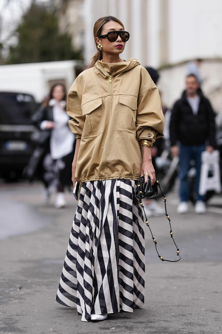 春の街中にマッチする、アクティブさを備えたシャカシャカ素材のベージュブルゾン。エアリーなフレアスカートは、ストライプ模様を選んでハツラツとした印象を加算。ブルゾンの袖をブラウジングし、立体感を手に入れました。