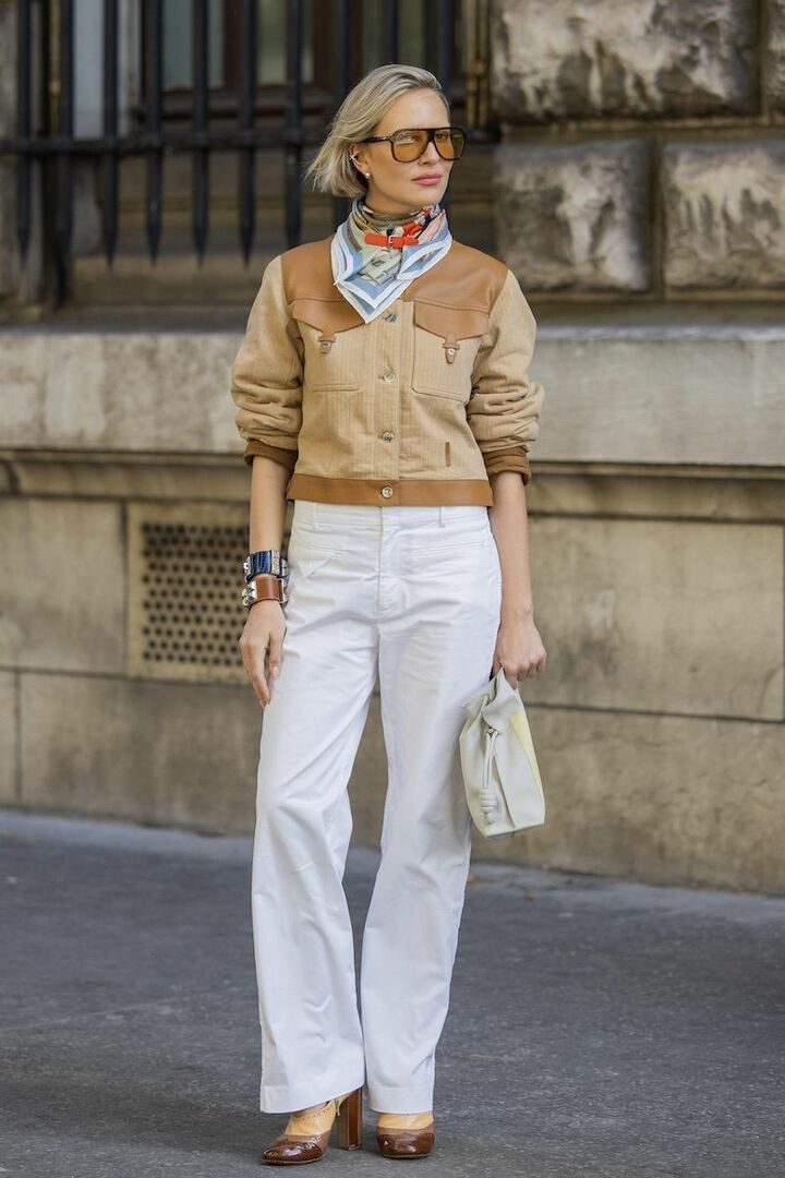 濁りのない真っ白なワイドパンツを合わせることで、ベージュブルゾンに切れ味のよさをトッピング。カラフルなスカーフやレザーバングルの重ね付けを使い、柔和な配色のエレガンスを引き出しました。ウエスタン調のブルゾンとブーツだから、スカーフはアフガン巻きが好相性。