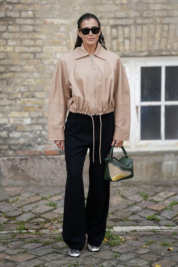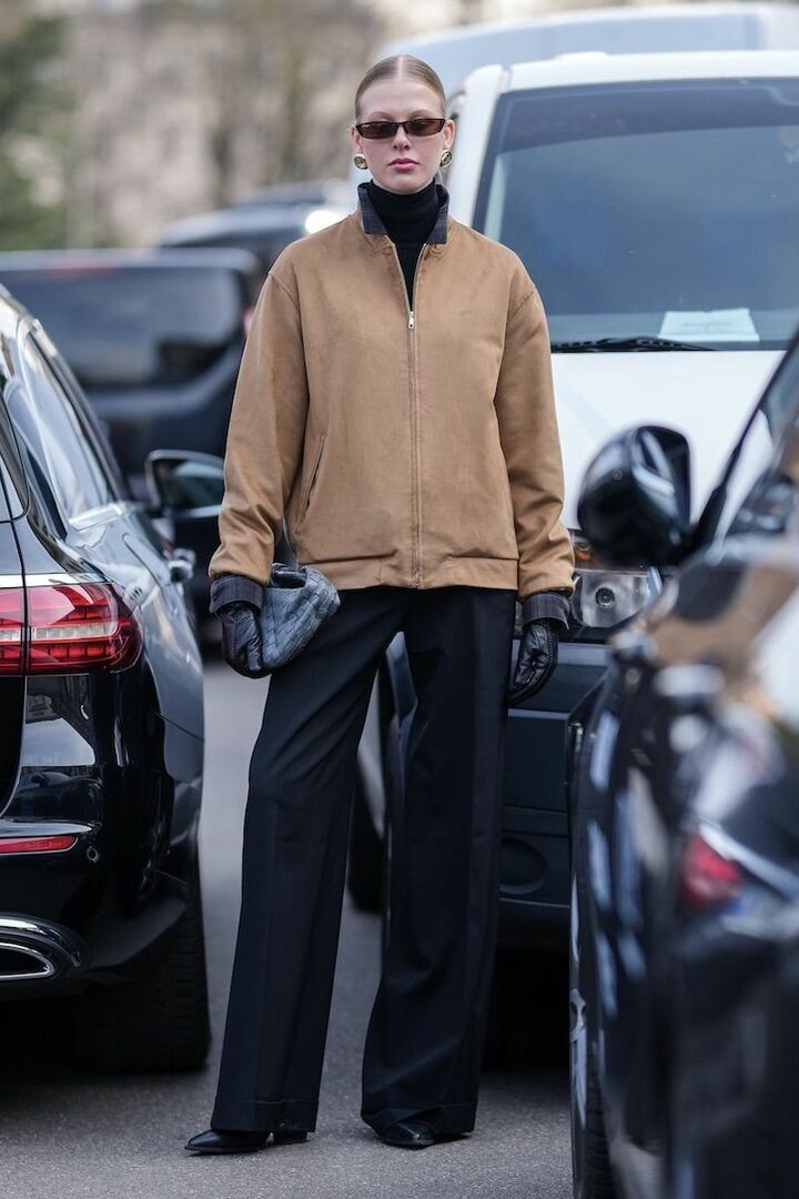 ベージュブルゾンと黒パンツのミニマルルックに、黒で統一したタートルニットとレザーグローブを加え、素肌をすっかりカバーすれば格好よさが高まります。スリークなセンターパートのまとめ髪、ゴールドイヤリングの合わせ技を使いモダンさを上乗せ。