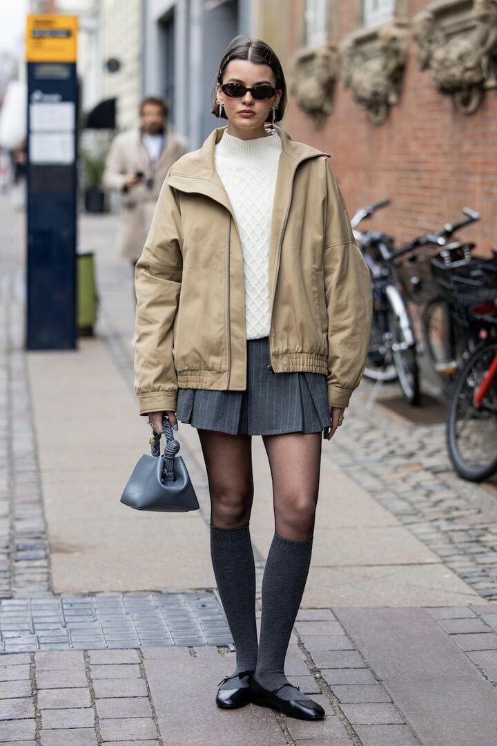 心地よい気候の秋の日には、軽アウターであるベージュのブルゾンがしっくり。やや長めの丈のブルゾンだから、ボトムはミニスカートを選ぶのが吉。シアータイツとグレーのハイソックスでグラデーションをつくれば洒落感がアップ。