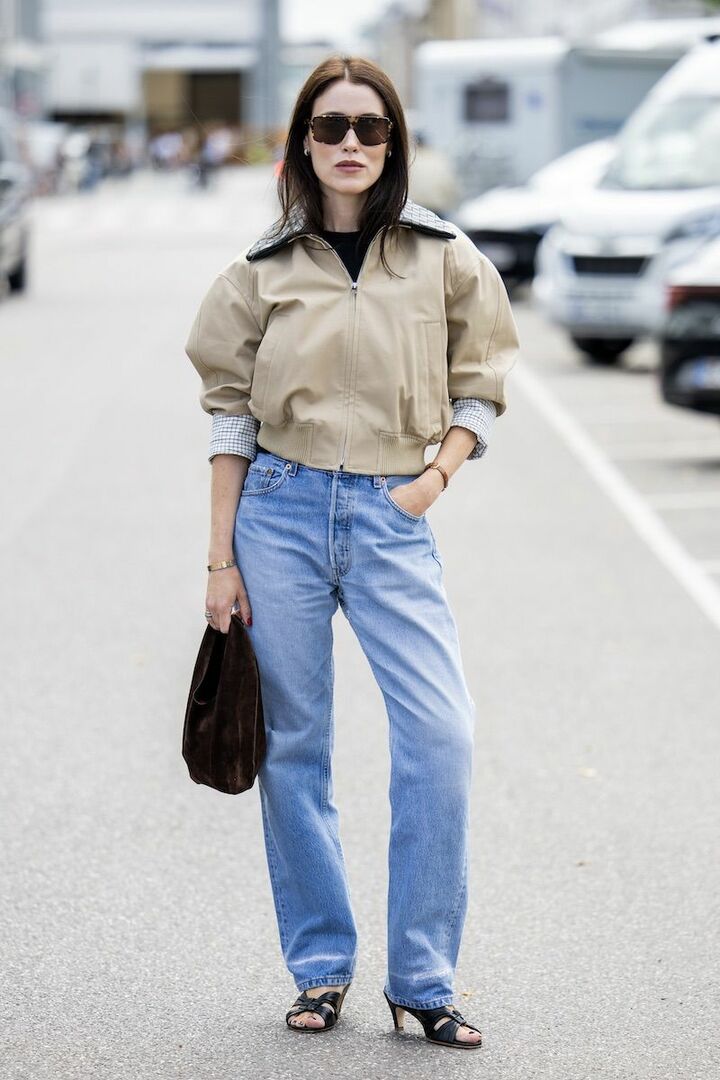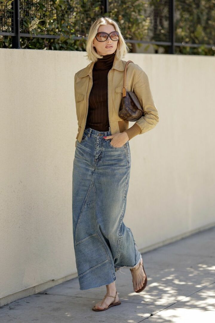 ベージュブルゾンとブルーデニムスカートのカジュアルスタイルは、エルザ・ホスクのようなコンパクトなブルゾンとタイトシルエットのスカートをセレクトし、すらっとさせると理想のきれいめカジュアルに。インナーとバッグはブラウンをリピートし、奥行きを演出。