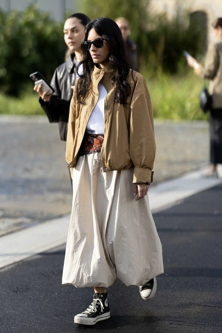 白で繋いだトップスとボトムスは、ふんわりとしたバルーンスカートがトレンド感をクリア。甘くなりすぎないよう、ワークテイストなブルゾンとスニーカーを使ってカジュアルダウン。ブルゾンは、白にマッチするベージュがちょうどいいです。仕上げにブラウンのスカーフを腰に巻き、上下が間延びしないように調整。