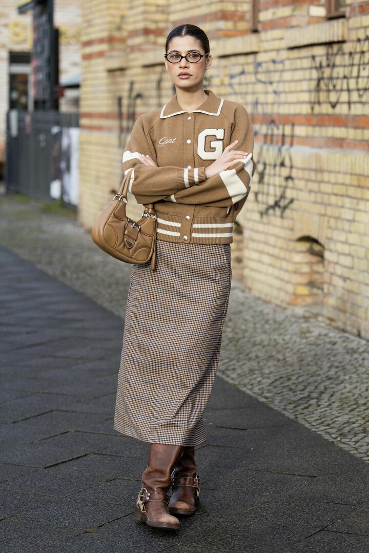 ベージュとブラウンで構成する、季節を感じる暖色コーディネート。ラインやワッペンがアクセントのブルゾンとチェック柄スカートをセレクトし、立体感をクリア。さらにきゅっと裾がすぼまったアウターとIラインのスカートだから、縦長効果を獲得することにも成功。