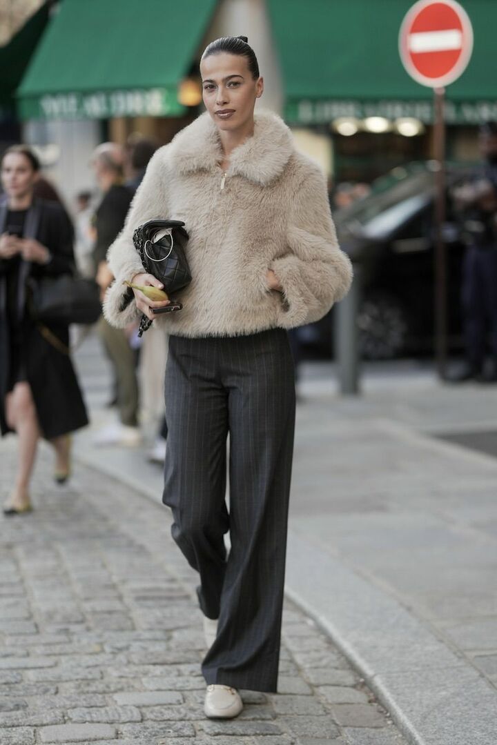 寒い冬には、ふわふわとした愛らしいベージュのファーブルゾンを採用。迫力が出がちなファーコートも、短丈ブルゾンなら扱いやすいです。知的なグレーのピンストライプパンツで甘さを抑え、大人の余裕を醸して。