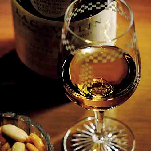 オリジナルのグラスに注がれた「ラガヴーリン16年」。「柿ピー」はこのバーで考案されたもの。