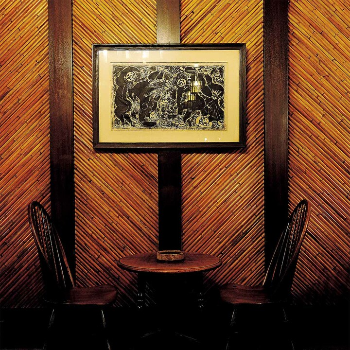 籐蓆(とむしろ)をバイヤスに組み合わせた壁面は、このバーの特徴的なデザインのひとつ。棟方志功の板画を間近にして、座り心地のいいイスに腰掛け、止まった時をいつくしむのも一興。