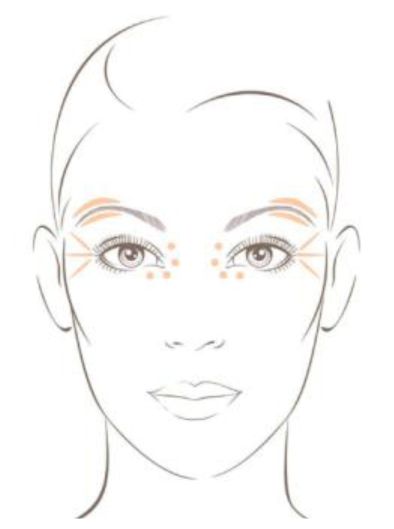 上下眉のアーチ、目頭のコーナー部分、目尻にのせることで、明るく艶やかな目元に。目元が明るくなることで、表情もパッと華やぎます。 -