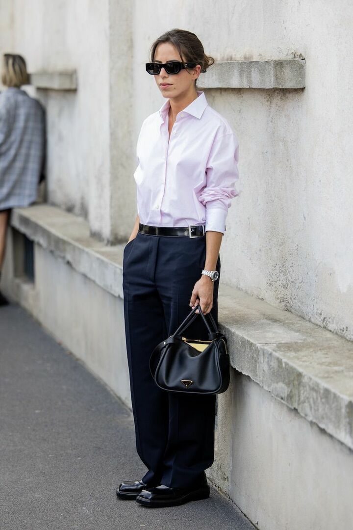 シャツ、スラックス、レザー小物でつくるマスキュリンコーディネートに、淡いピンクの甘さをひとさじ。ピンクが映えるのも、知的なネイビーがその色を引き立てているから。パンツのワイドシルエットが適度なリラックス感に繋がり、こなれ感が漂っています。