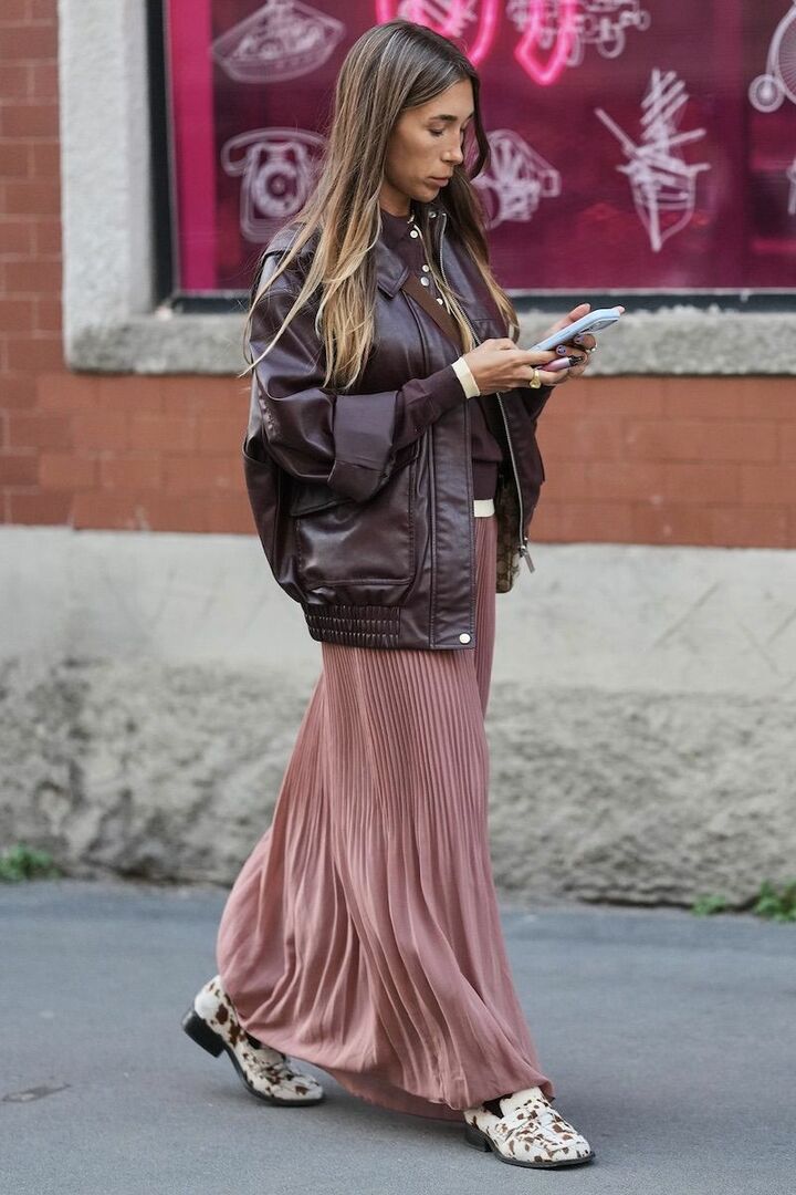 くすみピンクによって優雅さが高まるプリーツスカートを、ビターブラウンのレザージャケットで優しく引き締め。膨らみのあるジャケットと、すとんと落ちるスカートのメリハリが、穏やかなワントーンにリズムを添えます。