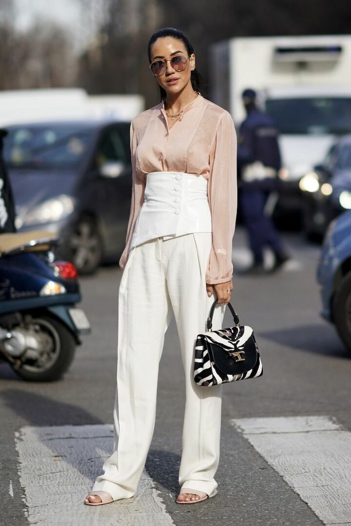 濁りのないクリーンな白を合わせることで、くすみピンクブラウスの柔らかさを引き出して。コルセットベルトやアニマル柄バッグでモードなエッセンスをプラスし、フェミニンとシャープさが交差する洗練されたバランスに仕上げました。
