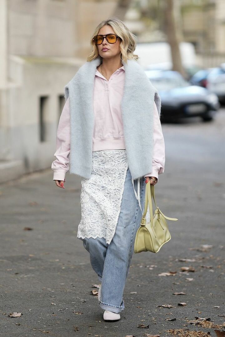 パステルトーンのピンクとブルー、イエローのレイヤード、そして白レースを盛り込んでもトゥーマッチにならないのは、親近感のあるデニムパンツで支えているからこそ。ラップスカートの開きがスリットのように機能し、淡いワントーンでも膨張せずすっきり。