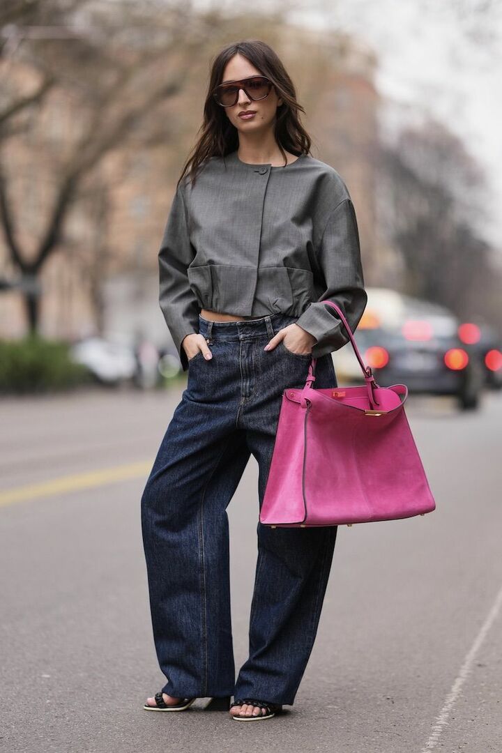 ノーカラーショートジャケットにワイドデニムパンツを合わせ、シルエットに緩急をつければグレーとインディゴの穏やかな配色ものっぺりしません。濃いピンクバッグをさらっと携え、シンプルのなかにインパクトを宿して。