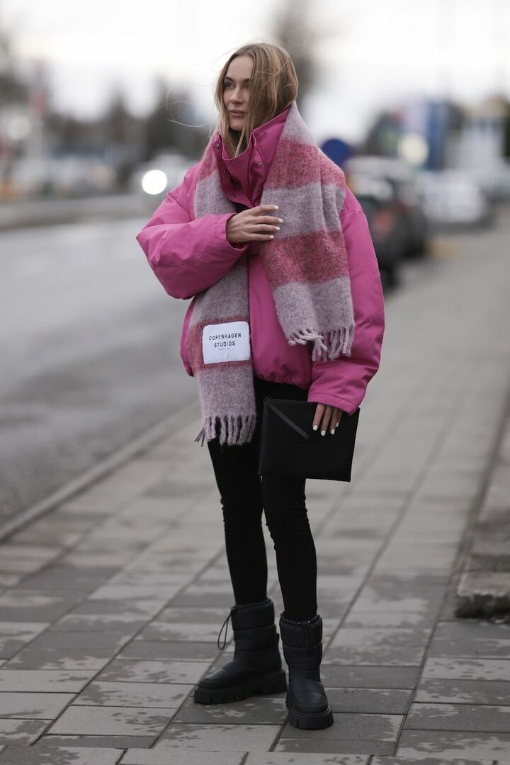 ふんわりと膨らむパファーコートは、濃いピンクを選ぶことで装いにインパクトを添え、無難を回避。スリムな黒スキニーパンツを合わせればメリハリのあるラインが生まれ、全体がすっきりと引き締まります。ダスティピンクのボーダーストールを重ね、奥行きと心地よいリズムをプラス。