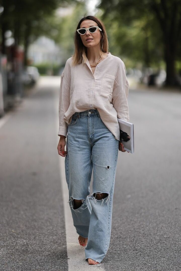 シャツとブルーデニムパンツの王道きれいめカジュアルは、ごく淡いくすみピンクのシャツを選び、装いにニュアンスをプラス。淡い色味がアクティブなデニムパンツとマッチして、軽快さが高まっています。シャツの裾はラフにインして、立体感をオン。
