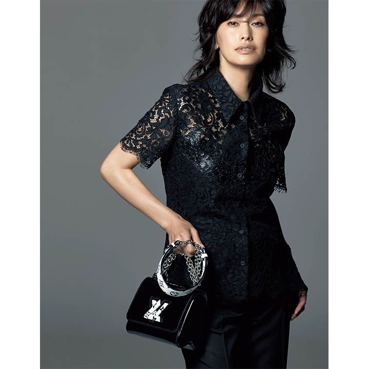 レースブラウスと美シルエットパンツを黒で統一。辛口エレガントな着こなしにバッグを投入して、モノトーンの「モノグラム・カラーロック」を際立たせて。最旬モードをクールに楽しむワンランク上の美意識を表現しましょう。