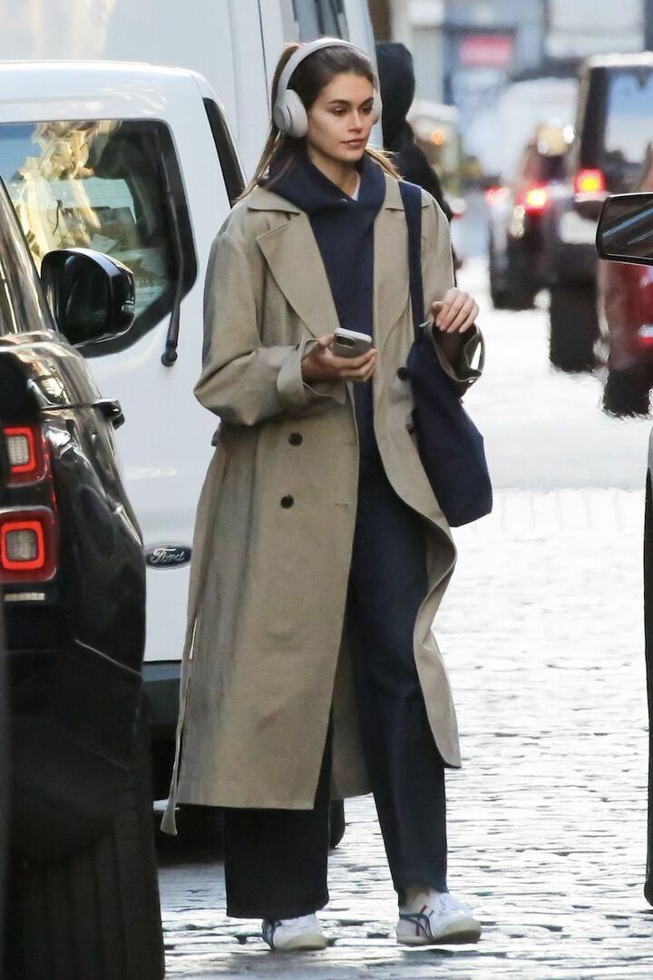 カジュアルをうまく融合させたきれいめスタイルに定評がある、カイア・ガーバー。端正なベージュトレンチコートと黒スラックスの組み合わせに、抜け感漂うアイテムを投入してミックススタイルをエンジョイ。パンツと同じ黒のパーカを選んだら、白スニーカーを迎えて軽快な足取りへ。