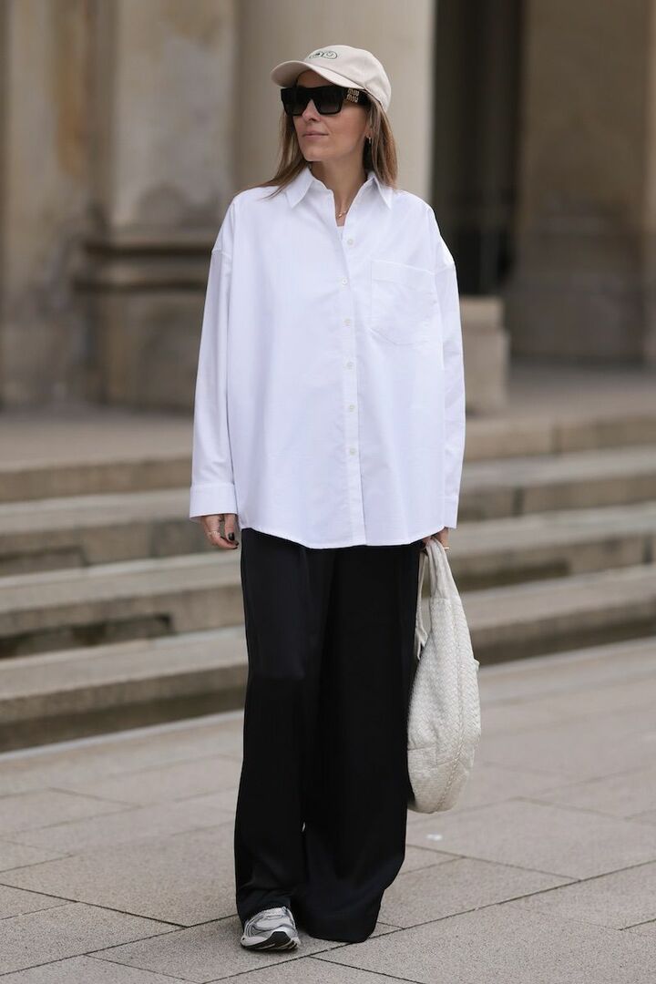 サイズをやや大きめに更新すると、白シャツと黒スラックスの生真面目なワンツーもエフォートレス。刺繍がアクセントのキャップとキレの良いシルバースニーカーを添え、スポーツ気分をミックスして軽やかに。最後にイントレチャートのバッグを投入して小気味よく仕上げました。
