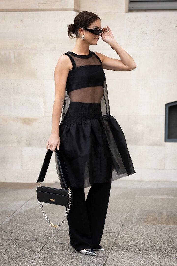オーガンジーのティアードワンピースをレイヤードし、シンプルプレーンなスラックスにモード気分とフェミニンさをプラス。冒険心のあるアイテムは、黒に任せればハードルが下がります。見本のようなブラトップはもちろん、キャミソールを忍ばせても素敵。