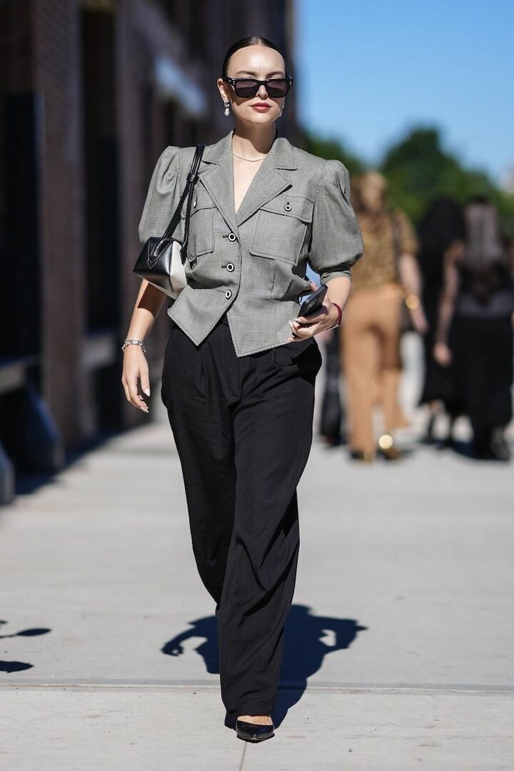ミニマルな黒スラックスにメリハリと飾り気をプラスするために、パフスリーブのジャケットをプラス。フェミニンなシルエットのジャケットも、黒とグレーの安心感のある配色に任せればきりっと大人顔。ヘアスタイルはシンプルにまとめ、赤のルージュやパールイヤリングの存在感を引き出して。