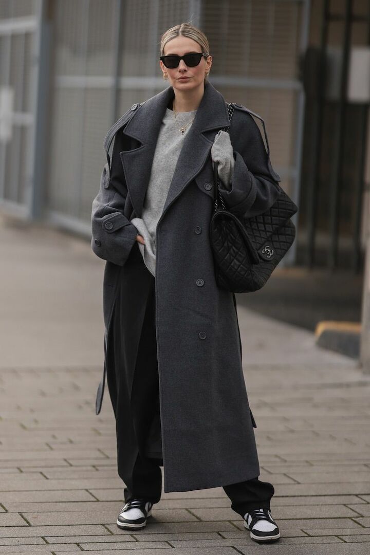 冬カジュアルに迫力が宿る、ビッグシルエットのコーディネート。モノトーン配色にしたり、端正なコートとスラックスを採用してラフになるのを阻止。スニーカーのシャープな白が切れ味のよさに繋がって。