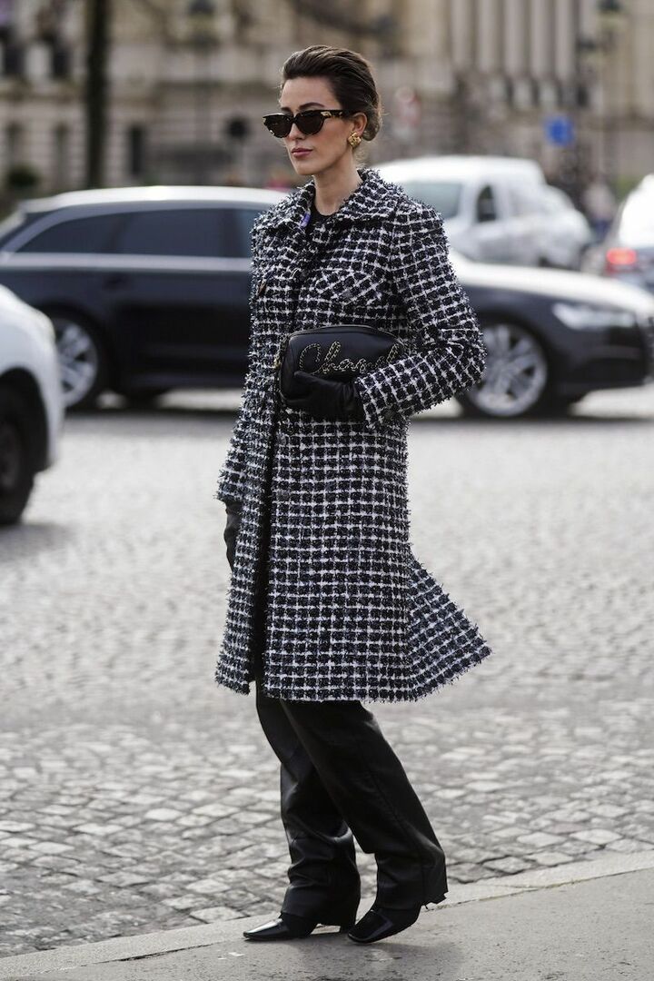 背筋が伸びるようなエレガントなツイードコートを、冬コーディネートの主役に。モダンさが倍増する黒レザーのパンツとグローブを足し、意志あるブラックコーディネートをコンプリート。