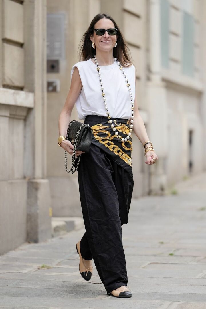 存在感のあるロングパールネックレスやエレガントなスカーフが活きているのは、シンプルな白ノースリーブトップスと黒パンツを選んでいるから。パンツはゆとりのあるシルエットを選び、コンサバティブに傾きすぎないようにすると今っぽさをまとうことができます。