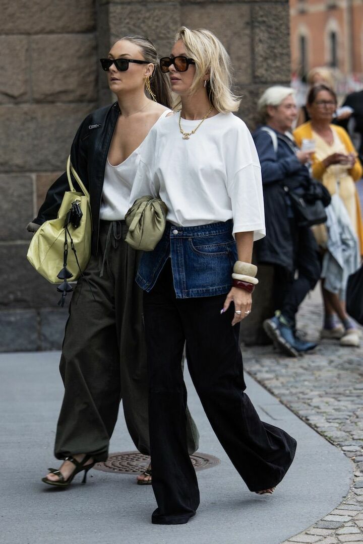 ブルーデニムのラップスカートをレイヤードする前提で、ベースは白Tシャツと黒パンツのミニマルコンビを選択。ビッグシルエットのTシャツが余裕感を漂わせます。チャンキーなマーブルバングル、存在感のあるネックレスがさらなる洒落感をクリア。