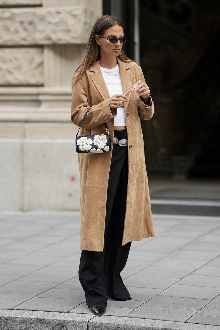 組み合わせるアイテムによって、がらりと表情を変える白カットソーと黒パンツのコンビ。ベージュのスエードコートを重ねて秋らしくアップデートしたら、シルバーのベルトと花柄バッグを足し、ウエスタン調にカスタマイズ。