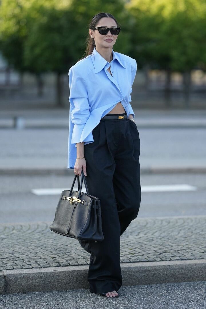 腰周りにゆとりが生まれる黒のタックパンツを、細ベルトでマークしてメリハリをオン。爽やかな春の気候にマッチする水色シャツは、ボタンをラフに留めると裾に動きが生まれて絵になります。さらにお腹周りを覗かせ、切れ味よく誘導。