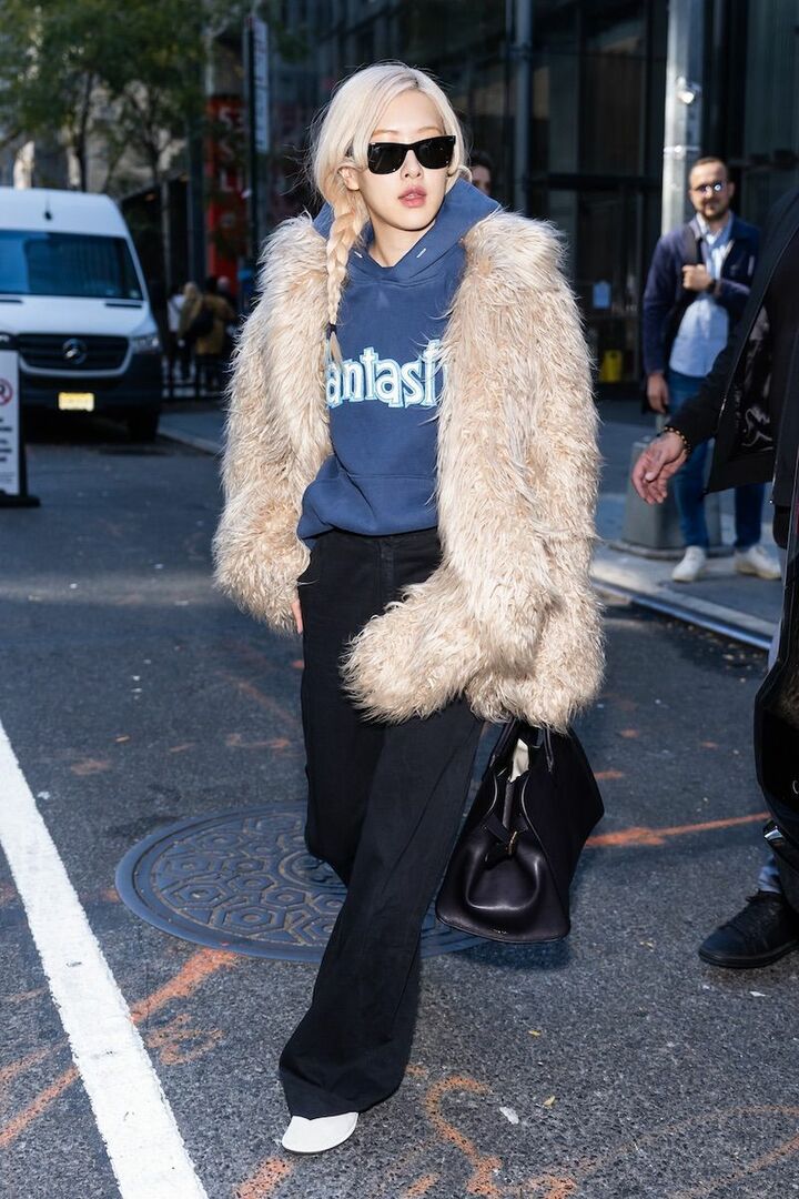 くすみブルーのパーカに、ふわふわとしたベージュのファージャケットを重ねていた「BLACKPINK」のロゼ。ボリュームのある上半身をすっきりと見せるために、ボトムは引き締め力のある黒パンツをセレクト。光沢感のあるレザーバッグを携えれば、クラスアップが実現。